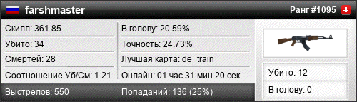 | 07.11.2016 @ 03:35 - 03:56 | de_dust | 00:21:15 | 18 | 10 | 3 | 16.67% | 27.49% | 280.59 |