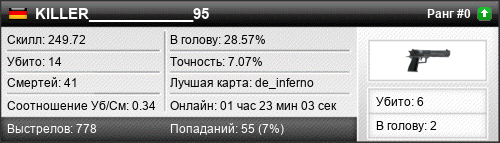 | de_inferno | 7 | 0.54 | 0.26 | 1 | 17 | 00:26:41 | 14.11.2016 | |