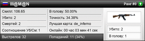 | de_inferno | 2 | 1.00 | 0.54 | 1 | 2 | 00:03:41 | 14.11.2016 | |