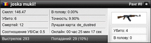 | de_dustred | 4 | 0.40 | 0.23 | 2 | 11 | 00:17:34 | 10.11.2015 | |