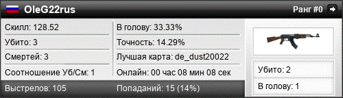 | de_dust20022 | 2 | 2.00 | 0.32 | 1 | 4 | 00:06:18 | 10.11.2015 | |