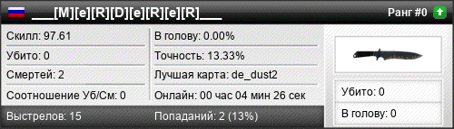 | de_dust2 | 0 | 0.00 | 0.00 | 1 | 2 | 00:02:29 | 24.11.2016 | |