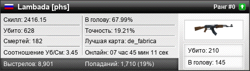 | de_badcore | 43 | 5.38 | 1.97 | 1 | 15 | 00:21:51 | 03.12.2016 | |
