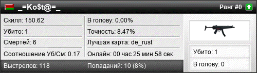 | 02.01.2017 @ 04:21 - 04:23 | de_mirage | 00:01:21 | 0 | 1 | 0 | 0.00% | 9.52% | 150.62 |