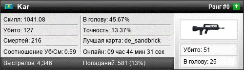 | de_ware | 6 | 0.43 | 0.21 | 1 | 19 | 00:29:12 | 25.01.2019 | |