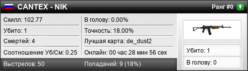 | de_dust2 | 1 | 0.33 | 0.29 | 1 | 4 | 00:03:24 | 28.05.2020 | |
