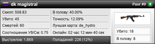| de_mirage | 5 | 1.67 | 1.29 | 1 | 4 | 00:03:52 | 26.12.2016 | |