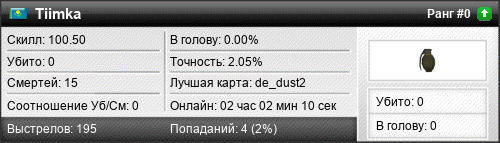 | 23.02.2016 @ 17:29 - 17:29 | de_dust2 | 00:00:03 | 0 | 0 | 0 | 0.00% | 0.00% | 102.55 |