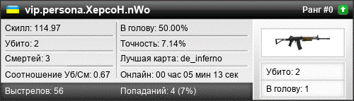| de_inferno | 2 | 2.00 | 0.61 | 1 | 2 | 00:03:17 | 01.01.2017 | |