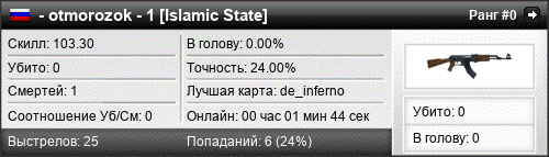 | de_inferno | 0 | 0.00 | 0.00 | 1 | 1 | 00:01:44 | 12.11.2015 | |