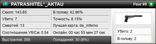 | 19.05.2017 @ 10:01 - 10:22 | de_killers | 00:21:05 | 0 | 0 | 0 | 0.00% | 0.00% | 143.85 |
