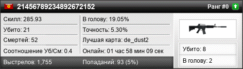 28.01.2017 @ 05:35 - 06:32 de_train 00:57:10 9 24 2 22.22% 4.91% 149.11 Разница: +28.30