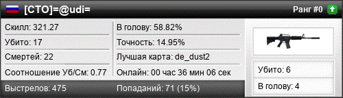 | de_dust2 | 11 | 1.22 | 0.66 | 2 | 10 | 00:16:43 | 26.05.2017 | |