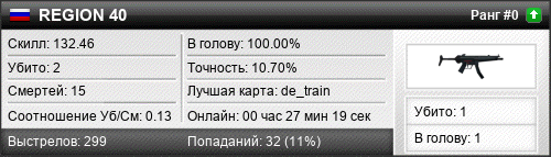 | 11.02.2017 @ 02:15 - 02:24 | de_train | 00:08:46 | 1 | 6 | 1 | 100.00% | 11.67% | 110.02 |