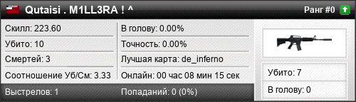 | de_inferno | 10 | 3.33 | 1.21 | 1 | 6 | 00:08:15 | 14.02.2017 | |