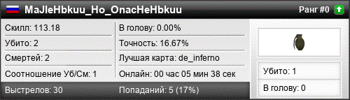 | de_inferno | 2 | 1.00 | 0.41 | 1 | 3 | 00:04:50 | 17.02.2017 | |