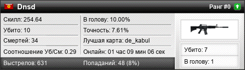 | 20.02.2017 @ 03:17 - 03:52 | de_aztec | 00:34:50 | 6 | 18 | 1 | 16.67% | 8.04% | 185.60 |