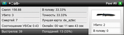 | de_aztec | 3 | 0.60 | 0.39 | 1 | 5 | 00:07:37 | 23.02.2017 | |