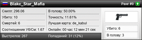 | de_inferno | 3 | 1.00 | 0.47 | 1 | 4 | 00:06:27 | 26.02.2017 | |