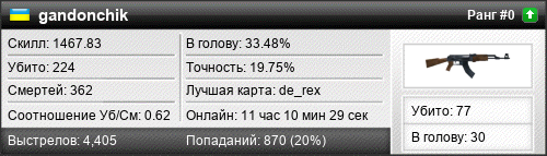 | de_overpass | 10 | 0.62 | 0.43 | 1 | 17 | 00:23:28 | 08.03.2019 | |