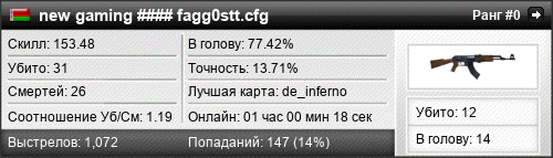 | de_inferno | 11 | 1.38 | 0.56 | 1 | 13 | 00:19:41 | 21.10.2015 | |
