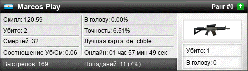 | 08.03.2017 @ 01:20 - 01:26 | de_online | 00:05:46 | 0 | 0 | 0 | 0.00% | 0.00% | 120.59 |