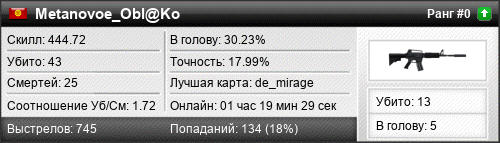 | 15.03.2017 @ 06:36 - 07:43 | de_mirage | 01:07:13 | 43 | 22 | 13 | 30.23% | 17.92% | 452.12 |