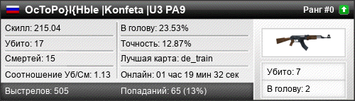 | 26.11.2015 @ 15:15 - 15:58 | de_nuke | 00:43:27 | 17 | 15 | 4 | 23.53% | 12.87% | 213.04 |