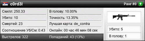 | 01.04.2017 @ 00:03 - 00:33 | de_dust20022 | 00:29:26 | 8 | 17 | 1 | 12.50% | 13.53% | 250.51 |