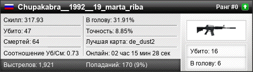 | de_dust2 | 26 | 0.84 | 0.41 | 4 | 37 | 01:03:05 | 28.07.2017 | |