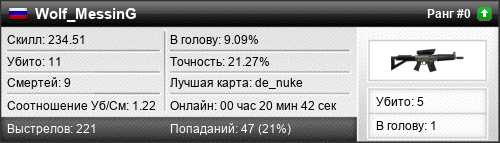| de_nuke | 9 | 1.50 | 0.56 | 1 | 10 | 00:15:57 | 03.04.2017 | |