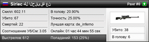 | de_inferno | 22 | 4.40 | 0.94 | 2 | 17 | 00:23:17 | 07.04.2017 | |