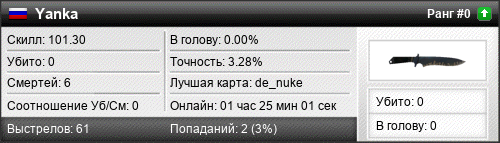 | 05.02.2020 @ 12:50 - 13:13 | de_aztec | 00:22:31 | 0 | 0 | 0 | 0.00% | 0.00% | 101.30 |