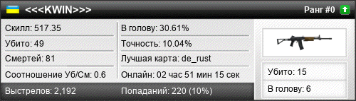 | de_mirage | 9 | 0.47 | 0.26 | 2 | 22 | 00:34:39 | 18.05.2017 | |