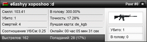 | 22.10.2015 @ 01:44 - 01:46 | de_kgb | 00:02:00 | 1 | 1 | 0 | 0.00% | 5.08% | 106.26 |