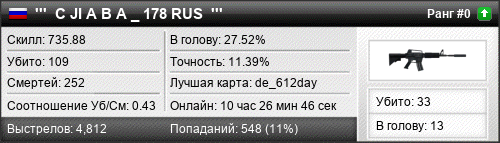 | de_aztec | 8 | 0.50 | 0.21 | 6 | 25 | 00:37:55 | 03.09.2017 | |