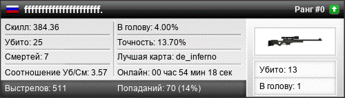 | de_inferno | 19 | 4.75 | 0.63 | 1 | 19 | 00:30:12 | 14.04.2017 | |