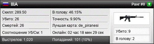 | 05.12.2015 @ 03:45 - 04:30 | de_kgb | 00:45:20 | 17 | 20 | 7 | 41.18% | 10.32% | 255.55 |