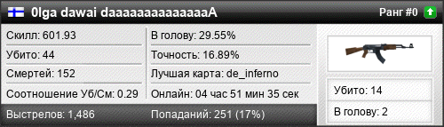 | de_dust20022 | 5 | 0.50 | 0.21 | 2 | 17 | 00:24:05 | 26.04.2017 | |