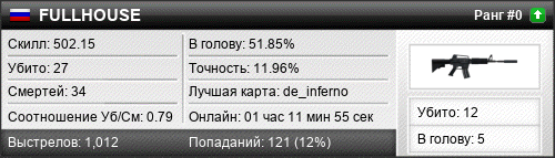| de_inferno | 20 | 1.05 | 0.50 | 2 | 27 | 00:40:16 | 07.11.2022 | |