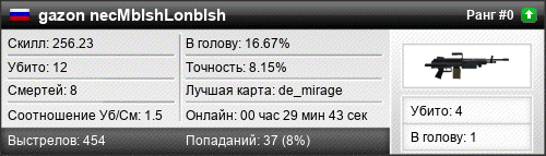 15.03.2018 @ 08:39 - 09:01 de_aztec 00:22:15 5 6 1 20.00% 4.63% 256.23 Разница: +72.30
