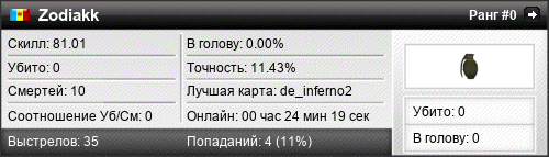 | de_inferno2 | 0 | 0.00 | 0.00 | 1 | 7 | 00:12:48 | 12.05.2017 | |