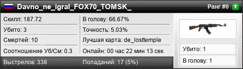 | de_losttemple | 3 | 0.30 | 0.14 | 1 | 13 | 00:22:13 | 13.05.2017 | |