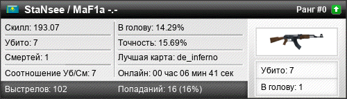 | de_inferno | 7 | 7.00 | 1.05 | 1 | 5 | 00:06:41 | 20.05.2017 | |