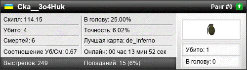 | de_inferno | 4 | 0.67 | 0.29 | 1 | 8 | 00:13:52 | 24.11.2015 | |