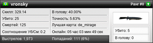 | de_mirage | 15 | 0.43 | 0.17 | 5 | 65 | 01:26:00 | 26.05.2017 | |