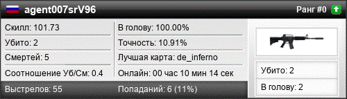 | 01.12.2015 @ 12:39 - 12:41 | de_cbble | 00:01:55 | 0 | 1 | 0 | 0.00% | 0.00% | 104.85 |