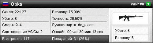 | de_aztec | 8 | 2.67 | 0.78 | 1 | 9 | 00:10:14 | 18.05.2020 | |