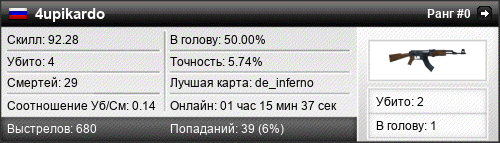 | 23.10.2015 @ 08:51 - 08:57 | de_inferno | 00:05:28 | 0 | 4 | 0 | 0.00% | 4.11% | 94.34 |