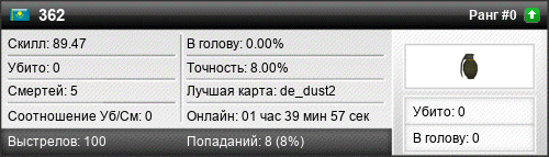 | 01.11.2016 @ 08:21 - 08:23 | de_dust2 | 00:01:48 | 0 | 0 | 0 | 0.00% | 0.00% | 100.00 |
